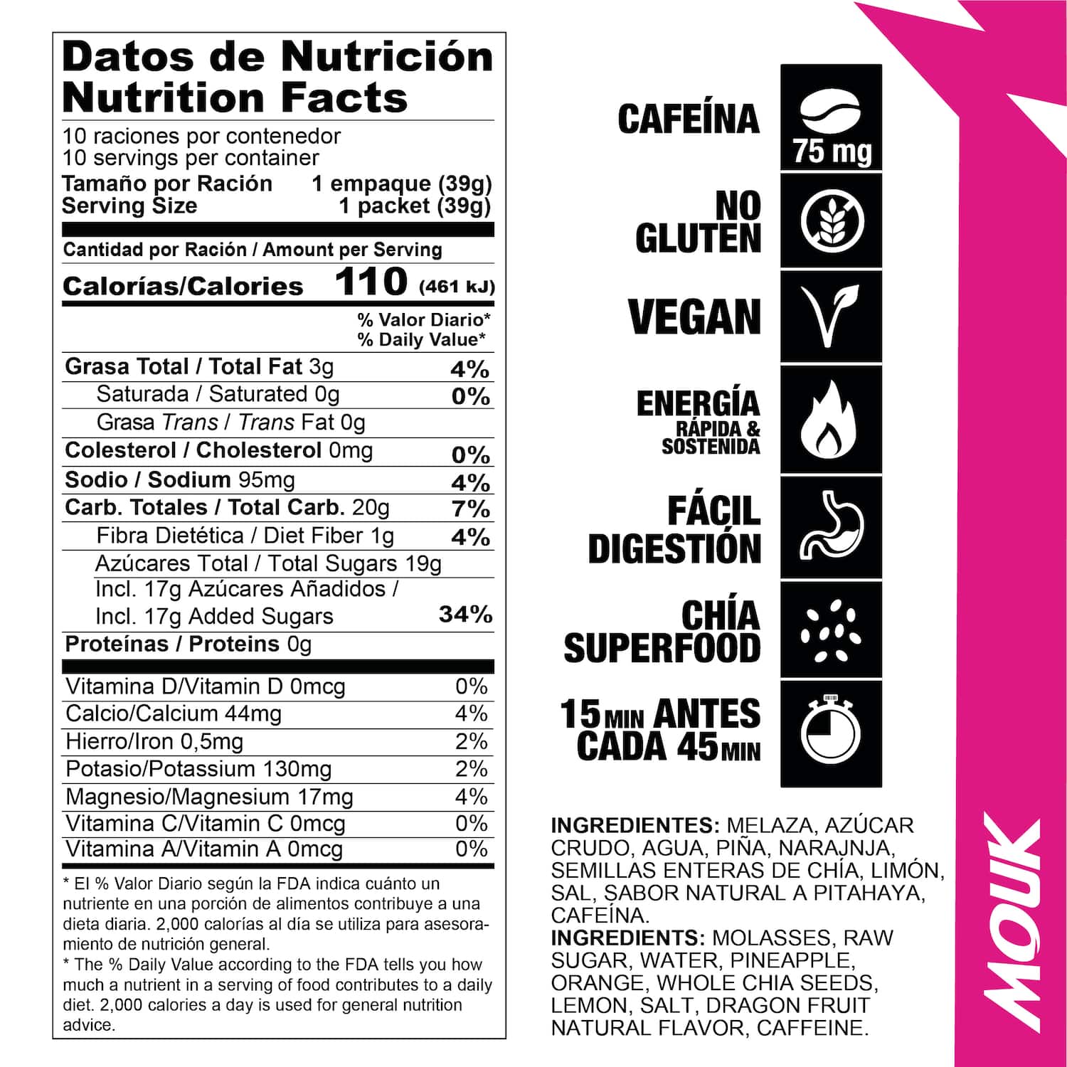 Cada Gel Energético MouK sabor Pitahaya contiene 39g con 75mg de Cafeína, 10 Cal (20g Carbo) y 540mg de Aminoácidos.